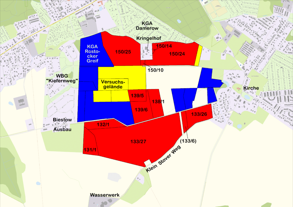 Geprüft werden soll, ob sich die unbebaute Biestower Feldflur als „Potenzialfläche“ für eine Bebauung mit „besonders familiengerechten Wohnformen wie Einfamilien-, Reihen- und kleinere Mehrfamilienhäuser“ eignet. Die WIRO soll einbezogen werden, weil sie dort noch reichlich Ackerland besitzt. Tatsächlich geht es im Antrag auch ausschließlich um Flächen, die sich im Eigentum der WIRO befinden. Im obigen Kartenauszug sind die WIRO-Flurstücke rot dargestellt, die angrenzenden blauen Flächen gehören der Stadt und die gelben Flächen sind Landeseigentum. Der Rest ist Privateigentum.